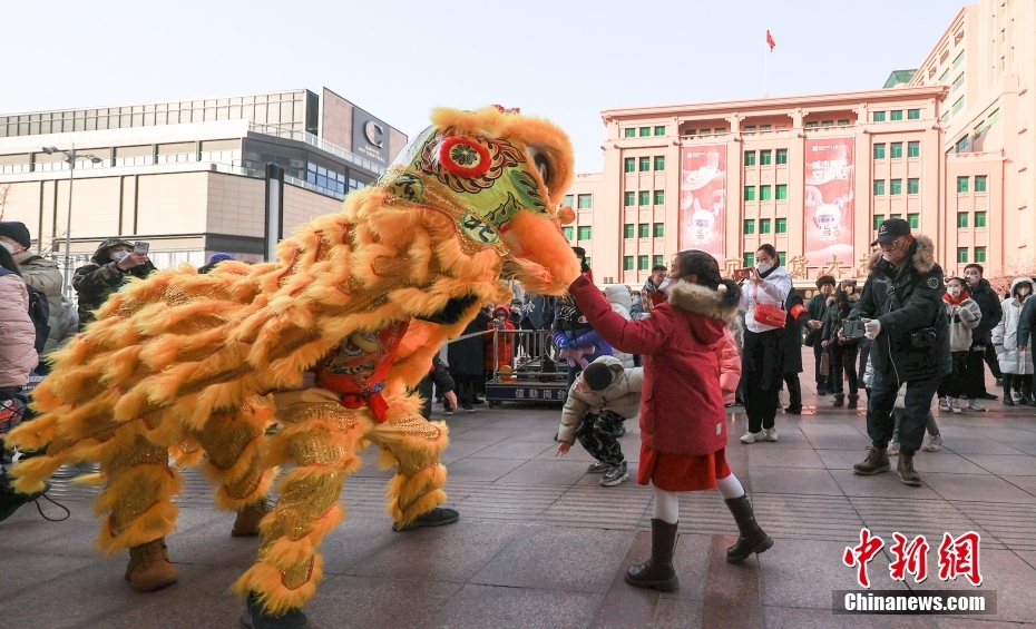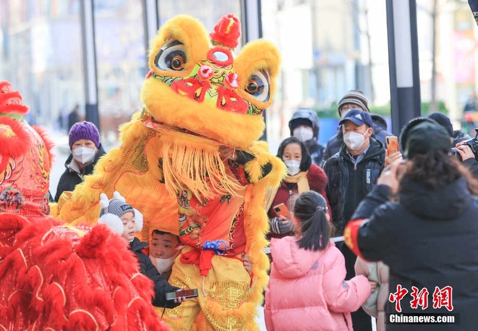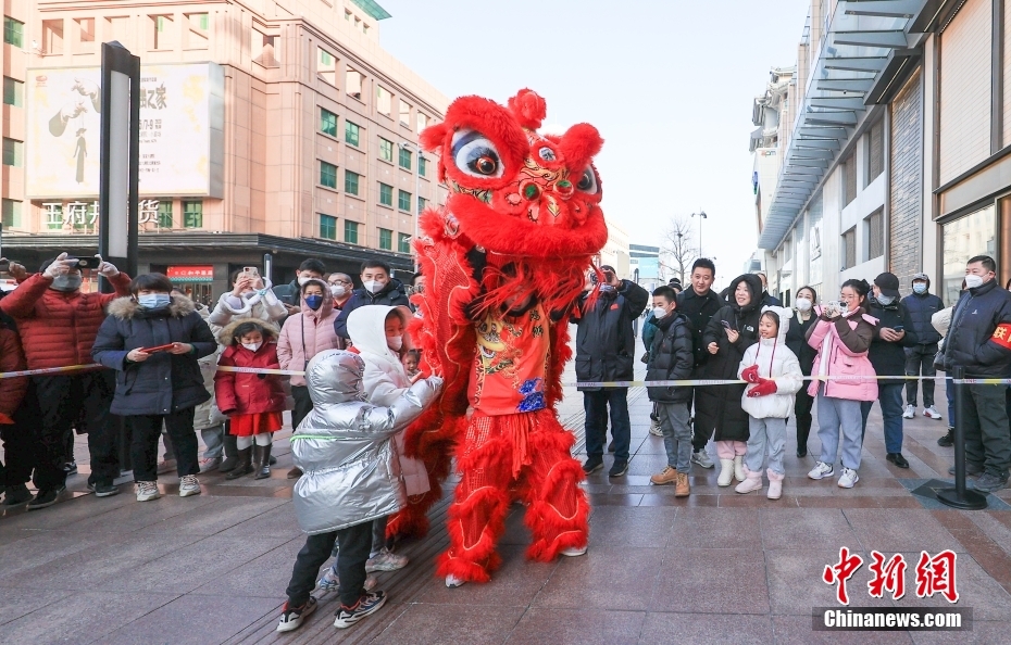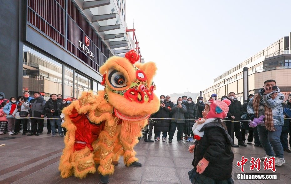1月22日,大年初一,北京王府井步行街上的东安市场门前,上演一场开年舞狮表演,迎接农历新年开市,预祝生意红红火火,也给市民和游客送去农历新年祝福。 中新社记者 贾天勇 摄