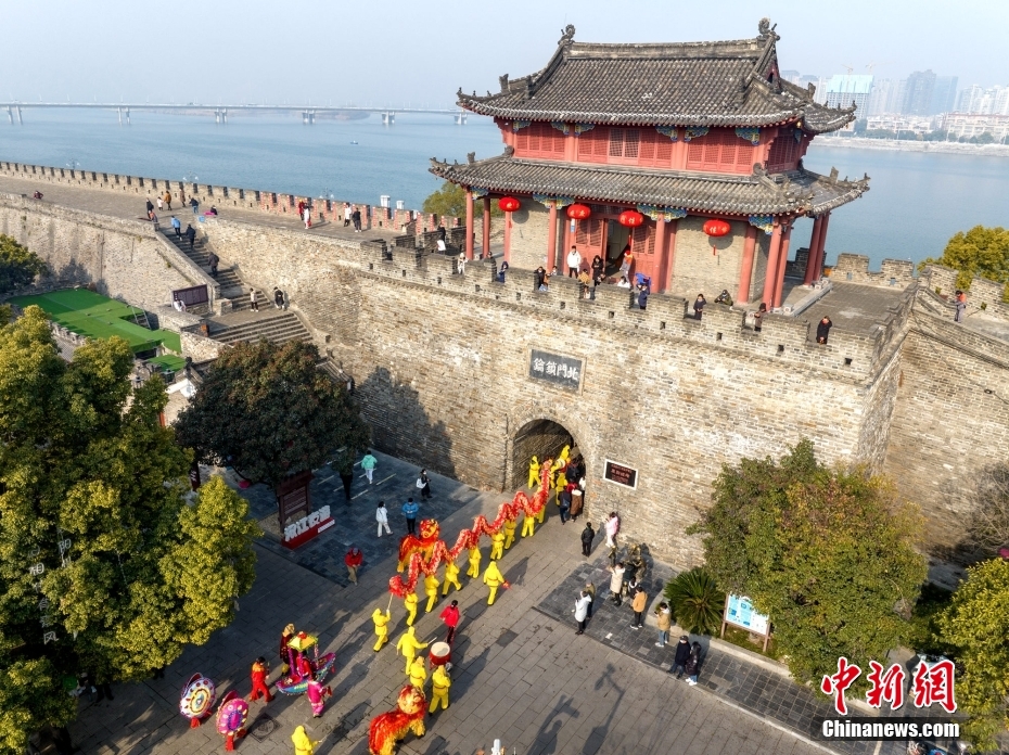 1月22日,农历大年初一,襄阳市襄城区举行2023“兔年民俗大拜年”民间文艺展演活动。在襄阳古城以及各乡镇文化广场,民间艺人们进行舞龙、舞狮、旱船、毛驴、蚌壳、大头娃娃、锣鼓等演出,热热闹闹庆新春。图为民间艺人在襄阳古城进行民俗表演(航拍图)。 杨东 摄
