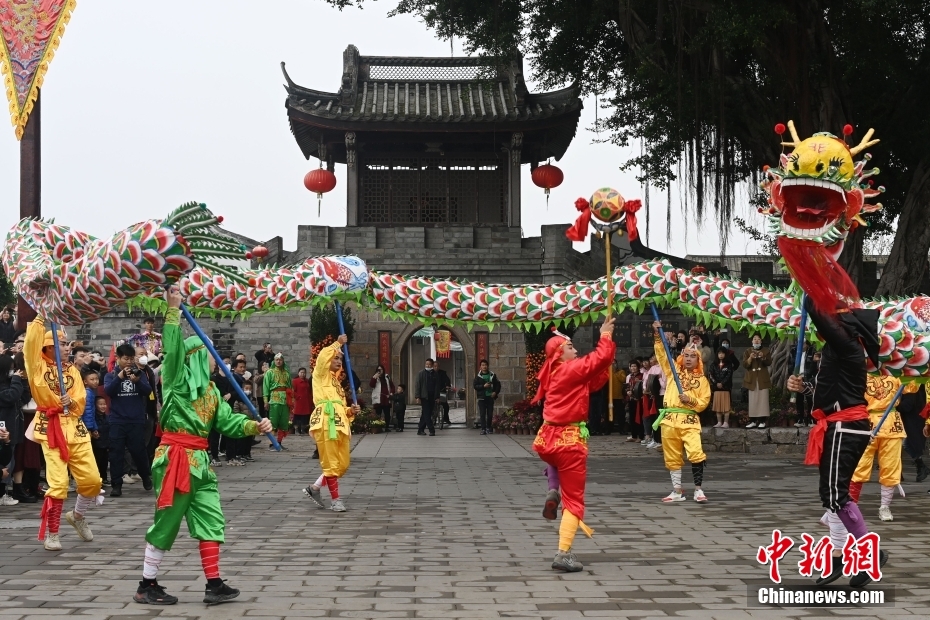 1月22日,农历正月初一,广东侨乡潮州,龙湖古寨舞龙贺新春。龙湖古寨内辟三街六巷,地形及建筑风格与古时潮州府很相似,有“潮州小城”之称。 中新社记者 陈楚红 摄