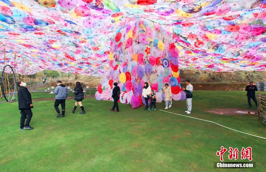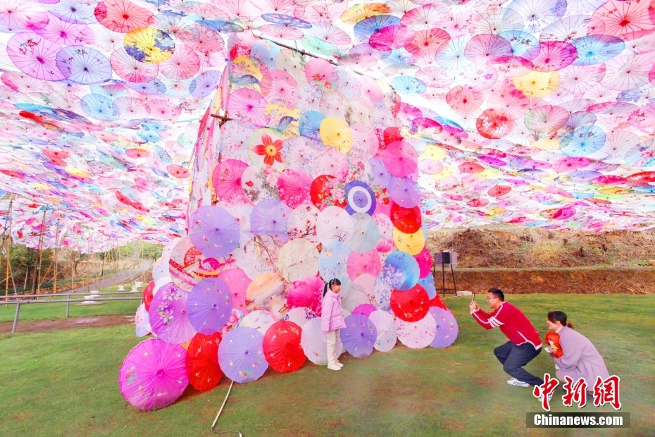 1月22日,正月初一,浙江省温岭市城南镇后岭花开嬉栖谷,游客在由近万把国潮春节油纸伞组成的“天空之伞”拍照留影。 中新社发 刘振清 摄 图片来源:CNSphoto