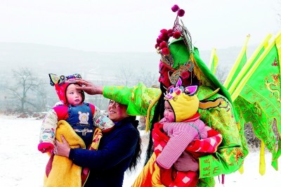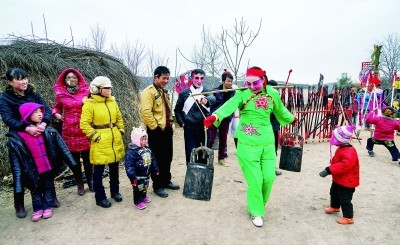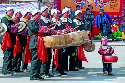 戴虎头帽的孩子跟着社火队员学打鼓。
