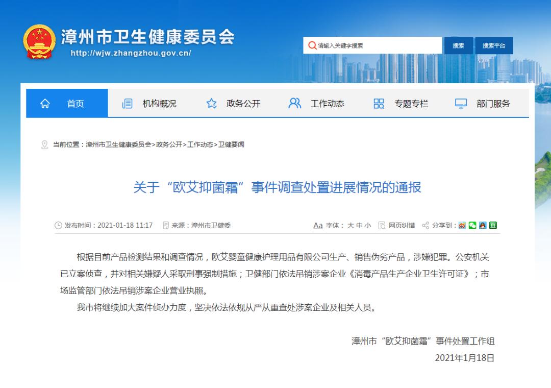 18日,福建漳州市卫健委网站发布事件调查最新进展:根据目前产品检测结果和调查情况,欧艾婴童健康护理用品有限公司生产、销售伪劣产品,涉嫌犯罪。公安机关已立案侦查,并对相关嫌疑人采取刑事强制措施。