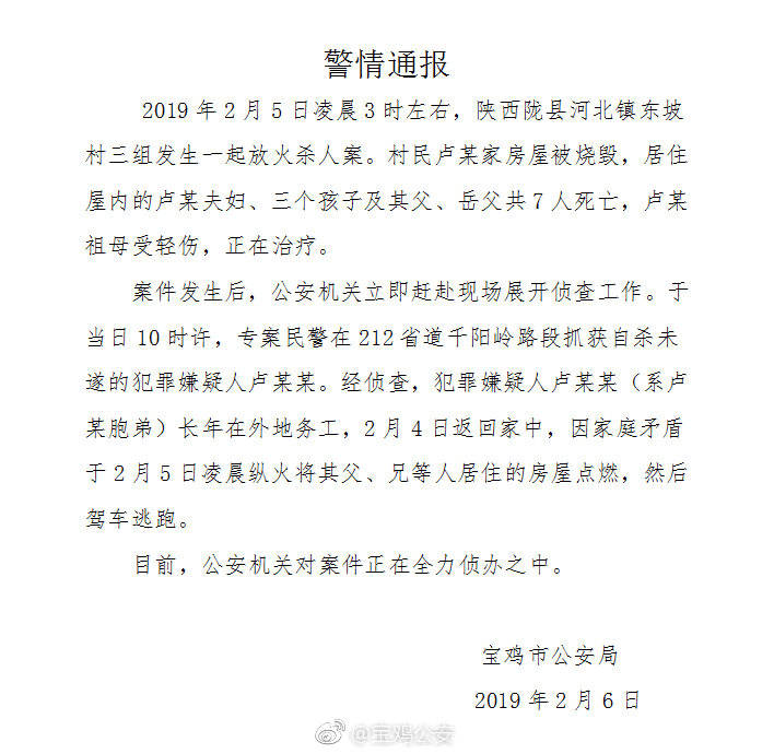 [摘要]2月6日晚上,记者从宝鸡市公安局了解到,2月5日凌晨3时左右,陕西陇县河北镇东坡村三组发生一起放火杀人案。村民卢某家房屋被烧毁,居住屋内的卢某夫妇、三个孩子及其父、岳父共7人死亡,卢某祖母受轻伤,正在治疗。