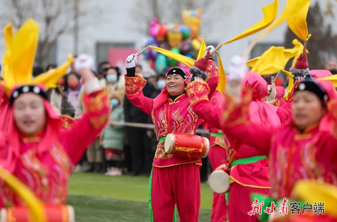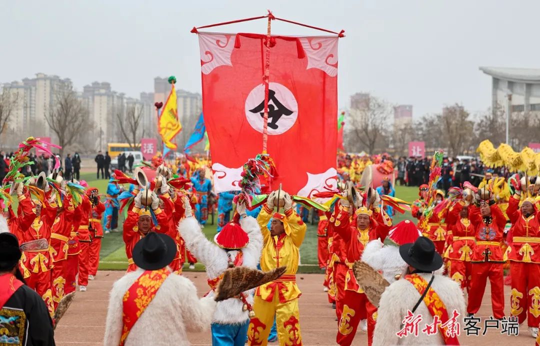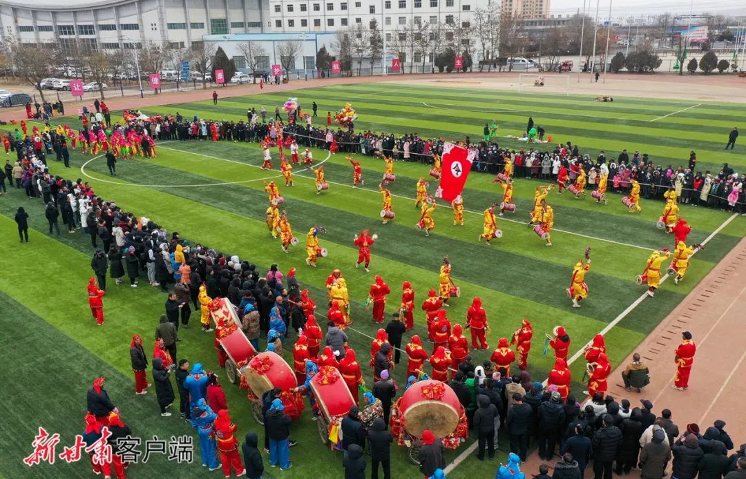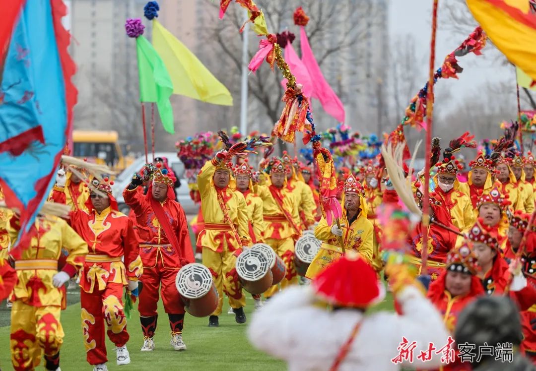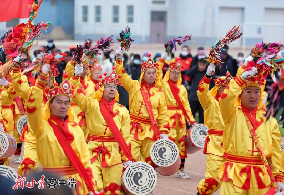 2月22日,在兰州市榆中县体育馆,清水驿乡稠泥河村社火队在表演太平鼓。