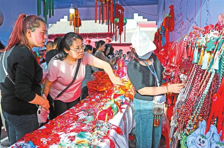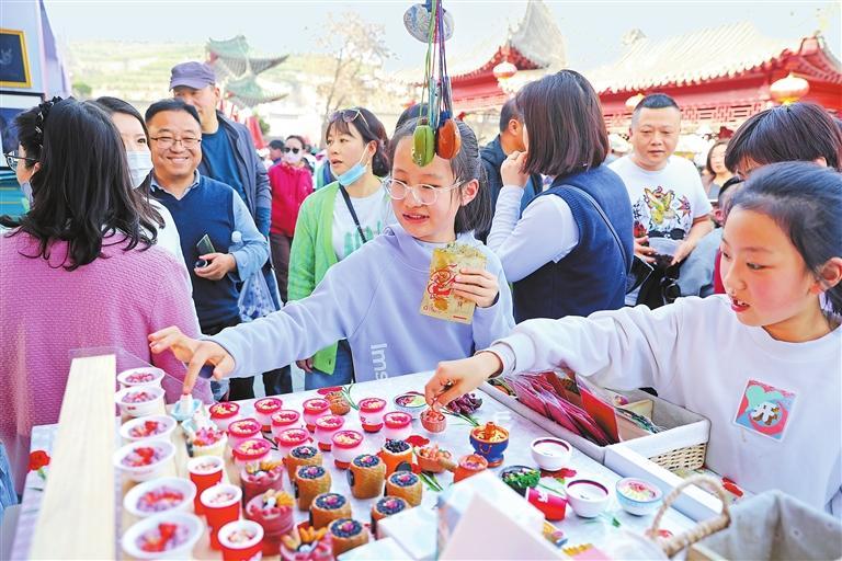 孩子们在甘肃文创非遗市集展销店选购心仪的文创产品。