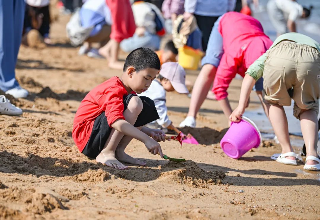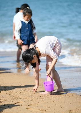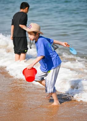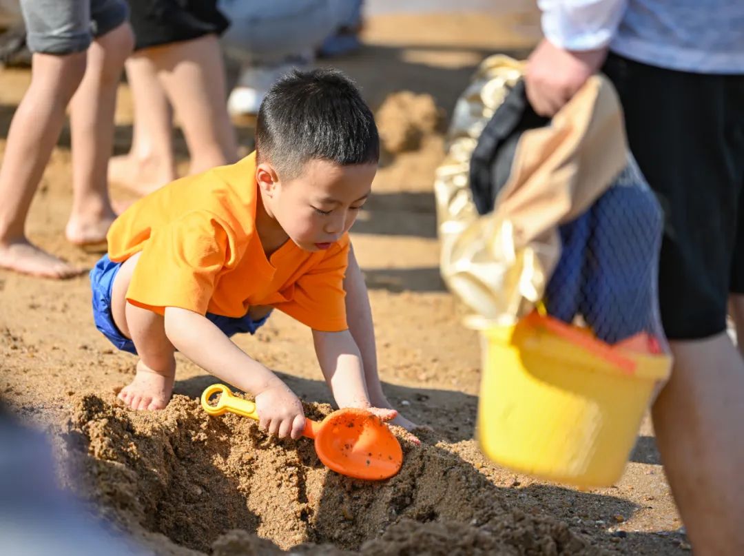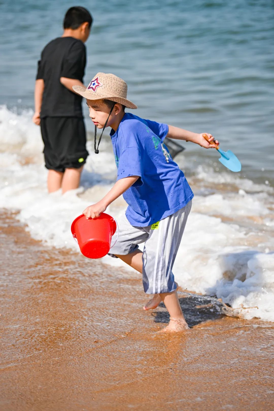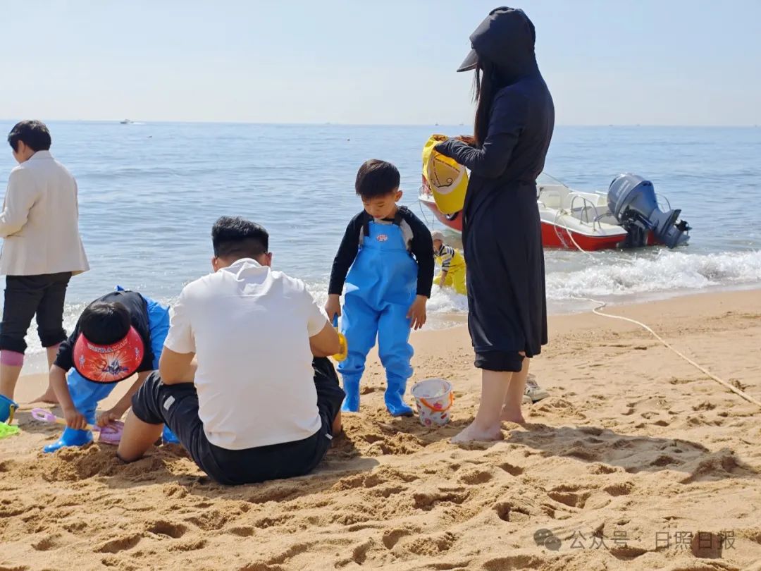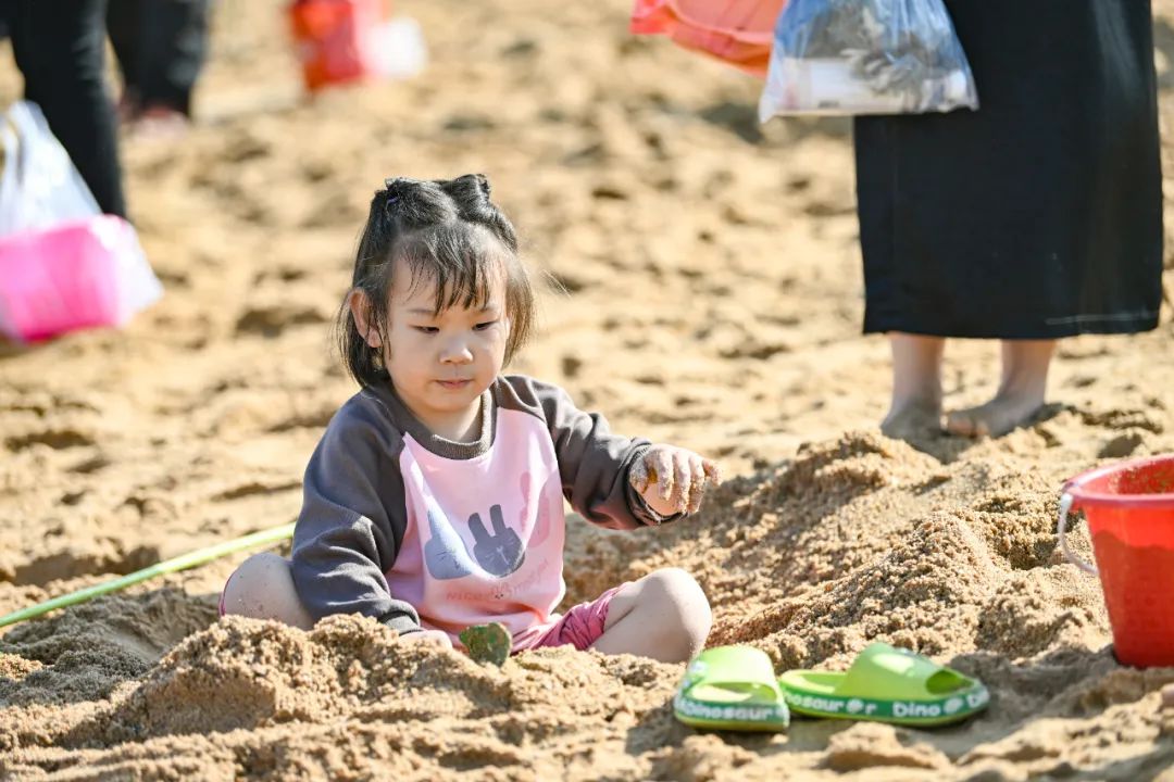 来自临沂的游客张女士,一大早和家人自驾来到日照,按照导航顺利停下车,就直奔这片金沙滩而来,“孩子太喜欢玩沙子了,在家的时候,我们就准备好了小桶和小铲子,来到沙滩,拽都拽不走,根本玩不够!孩子说,这细软的沙子就像自己暖暖的小被子呢!”