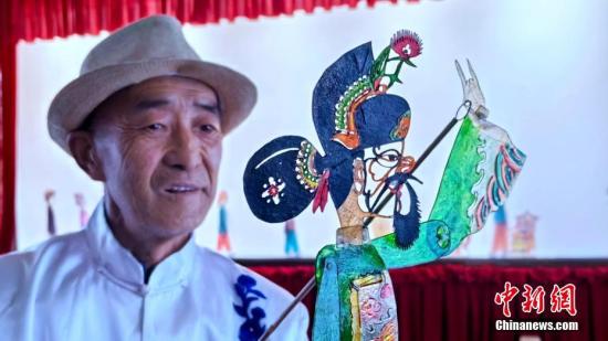 图为当地皮影艺人展示皮影雕刻艺术。李隽 摄