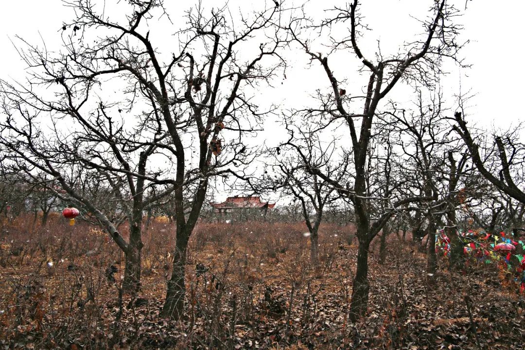 见到冬季萧条的百年老梨树群,可以想象苗老师在文章中所描述的"夏秋季节硕果累累,金黄香脆,令人馋涎欲滴若至寒秋时节,朔风起处,声如笳瑟,漫川霜叶,似红霞,如烧云,美不胜收中染尽层林,犹如香山红叶之再造"。