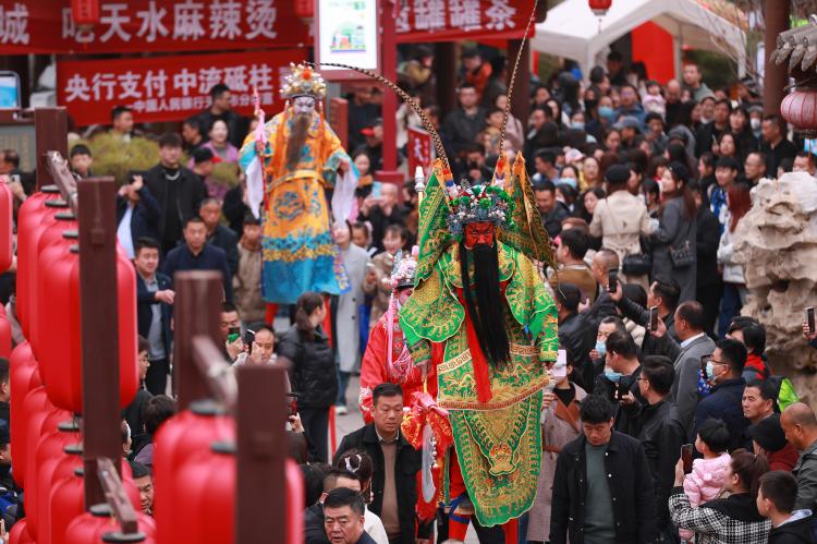 其中,甘肃“醉关公”小林子颇具代表性。手持青龙偃月刀的小林子脚踩2.2米的高跷,步伐豪迈,威风凛凛,边走边举起路人递过来的美酒一饮而尽,微醺之间,浑身上下洋溢着关公大义凛然、义薄云天的神情与气概。