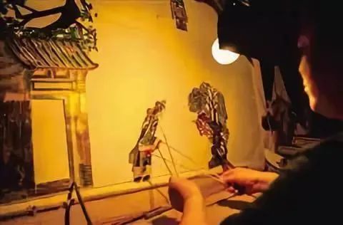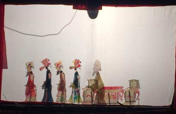 皮影戏演出时,“亮子”的前面是观众,后面是演绎室,“亮子”的正后方是“灯盏”,“皮娃娃”在“灯盏”和“亮子”之间而且贴在“亮子”上,“皮娃娃”在“亮子”的投影就是“剧情”。