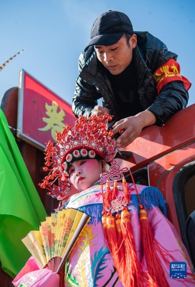 2月19日,西安市临潼区栎阳街道卷子村村民为即将上阵表演“背芯子”的小朋友整理装束造型。