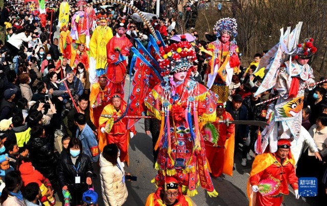 2月19日,西安市临潼区栎阳街道卷子村村民在村头巡回表演“背芯子”。