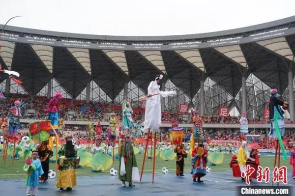 图为开幕式现场进行鲁沙尔高跷表演。 马铭言 摄