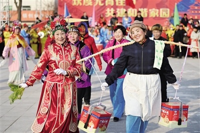 ▲2月3日,合阳县坊镇坊西村群众在街头扭秧歌。新华社发
