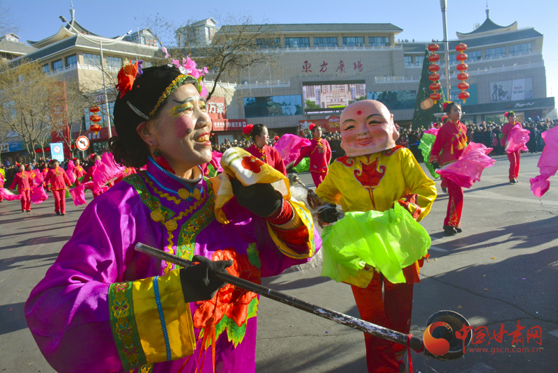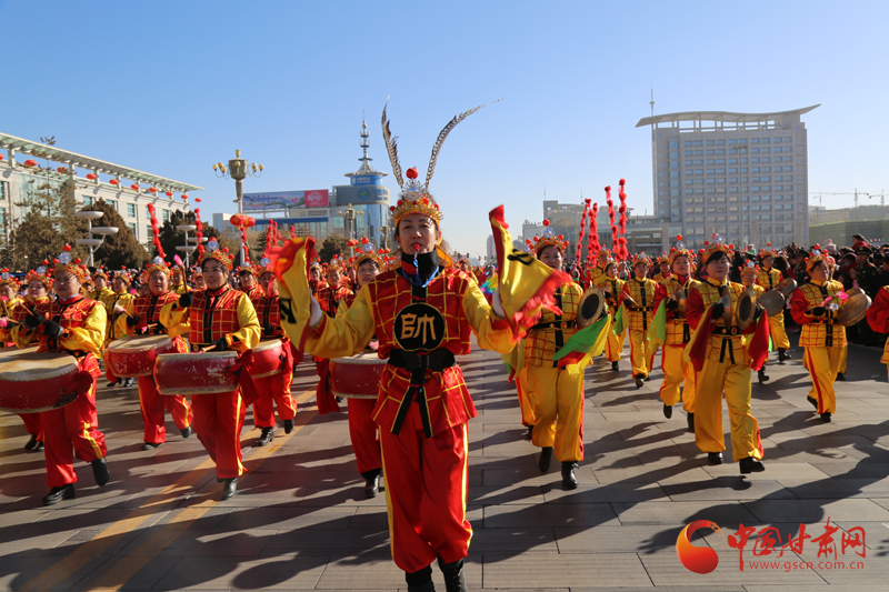 9点48分,击鼓仪式开始。随后,震耳欲聋的威风锣鼓轮番登场,时紧时缓的鼓点犹如滚滚春雷响彻大地;花团锦簇的旱船引人注目,赶船姑娘身着彩裳尽显婀娜;一头头威武的狮子腾挪跳跃,一条条长龙上下翻腾,仿佛在云中穿梭,灵动自如。此外,社火表演队带来的“地蹦子”、“福禄车”、“赶驴”等省级非物质文化遗产保护项目的精彩表演,让肃州老百姓过足了“社火瘾”。