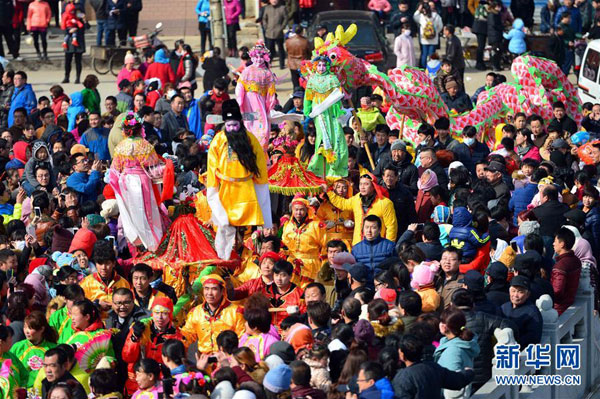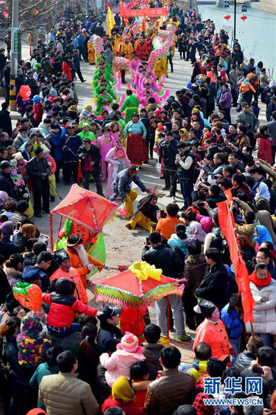 2月21日,社火队在进行巡游拜年。当日,有着千年历史的传统村落——山东省章丘市三德范村组织31个社火队举行社火巡游拜年活动,在元宵佳节来临之际为乡亲们送祝福。新华社记者 郭绪雷摄
