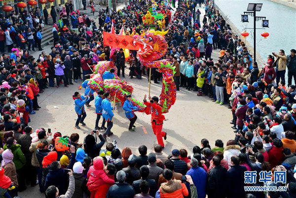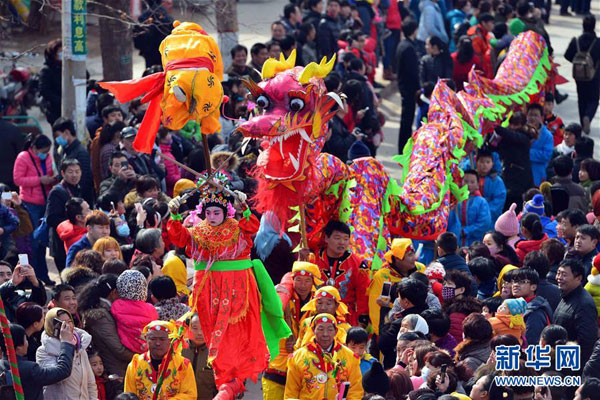 2月21日,社火队在进行舞龙表演。当日,有着千年历史的传统村落——山东省章丘市三德范村组织31个社火队举行社火巡游拜年活动,在元宵佳节来临之际为乡亲们送祝福。新华社记者 郭绪雷摄