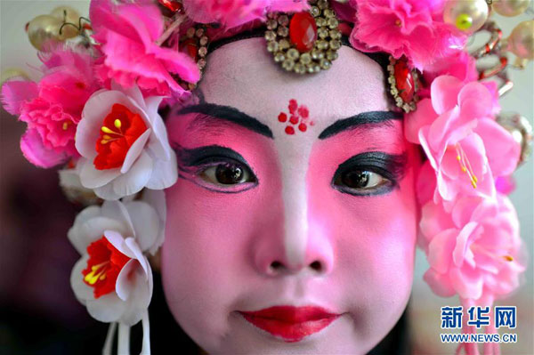2月21日,一名小演员扮上妆准备参加社火表演。当日,有着千年历史的传统村落——山东省章丘市三德范村组织31个社火队举行社火巡游拜年活动,在元宵佳节来临之际为乡亲们送祝福。新华社记者 郭绪雷摄