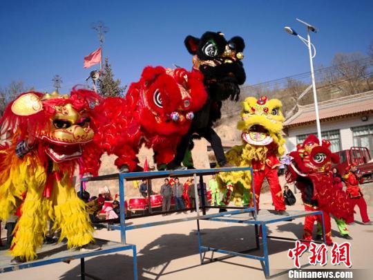 日前,中新网记者走访甘肃省定西市安定区杏园乡牛营村时看到,在黄土塬生活的村民们不畏天气严寒,家家户户都积极参与到社火队的排演中,广场上鼓声阵阵,舞龙、耍狮、扭秧歌……村民们个个热情高涨。