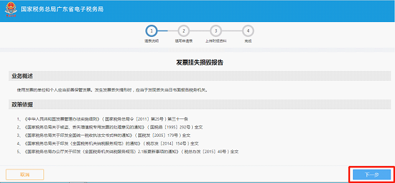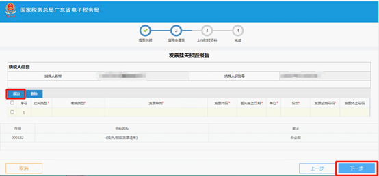 5.点击【新增】,在新增的一行里填写相关发票信息,其中挂失类型可以选择 “丢失”、“被盗”、“损毁”,缴销类型可以选择“空白发票丢失、被盗”、“已验旧发票存根联丢失被盗”、“未验旧发票存根联丢失被盗”。据实填写表格完后,点击【下一步】,进入“上传附报资料”界面。
