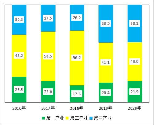 2016年—2020年三次产业增加值占生产总值比重(%)