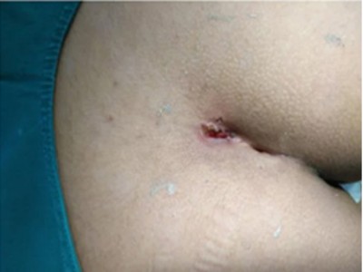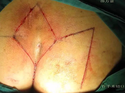 藏毛窦患者,臀部皮损表现为出现单个形状不规则的脓包,绿豆至黄豆大小,皮损周围伴有淡淡的红晕,经搔抓破溃后可形成窦道,也就是形成开口于皮肤或黏膜的盲性管道,且只有一个开口,反复发作,经久难愈。