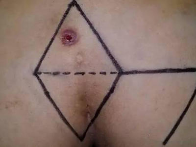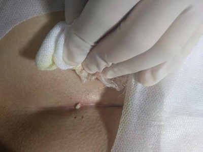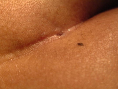 藏毛窦表现为患者臀部形成一个浅表性脓肿,形状不规则,皮损中央破溃结痂,下方有一个圆形小孔,明显凹陷于皮肤,多数患者无明显疼痛,偶有患者反复出现肿痛、流脓。