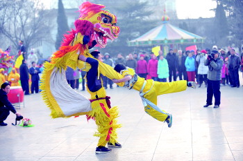 “我上山是虎,我下海是龙,我在人间是堂堂的大英雄。我挥手起雨,我舞动生风,看我东方升腾的中国龙!”1月31日上午10点50分刚过,一曲旋律激越的《中国龙》在华联广场奏响,20个身着黄色短衫长裤的少年拖着单刀,威风凛凛地出现在舞台上。他们的亮相引来阵阵喝彩。