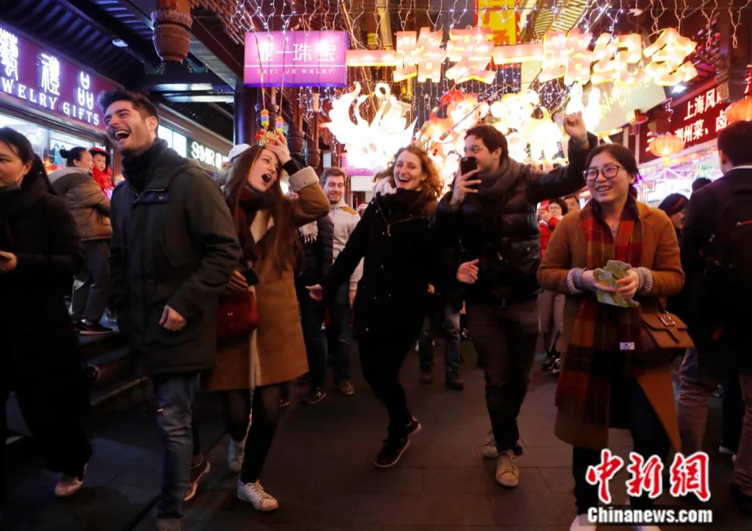 2018年3月,中外青年游客在上海豫园观灯、闹元宵。中新社记者 殷立勤 摄