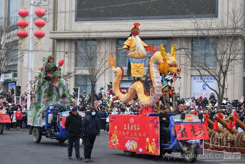 2024年2月22日,社火队正在甘肃省天水市麦积区街道上进行表演。
