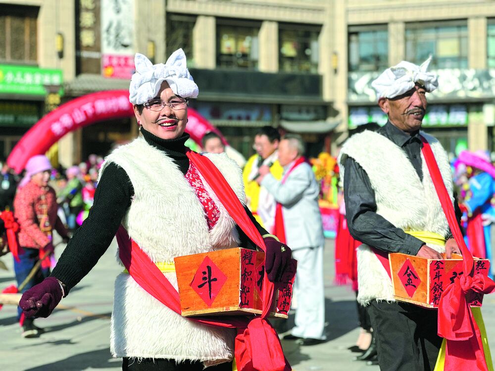 长龙祈福、金狮拜年、高跷走秀、锣鼓庆祝……身着盛装的社火队员个个精神抖擞,踏着鼓点尽情表演。威风凛凛、精神抖擞的雄狮,和着豪放粗犷的锣鼓声摇头摆尾、欢腾跳跃。憨态可掬的大头娃娃、翻飞的彩扇、华丽的旱船……花样繁多的社火表演,大家看得津津有味,纷纷用手机拍摄记录着精彩瞬间。