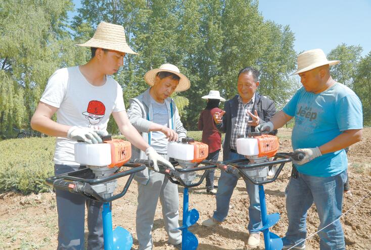 2017年5月16日,刘贵明给村民示范新买的种树设备使用方法。通讯员 王国栋 本报记者 姚斌摄