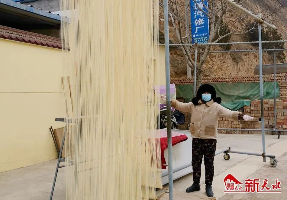 匠心,传承,幸福。晾晒架上,一丝丝挂面无声地“晒”着黄庄村村民的幸福。(新天水记者 余碧波)