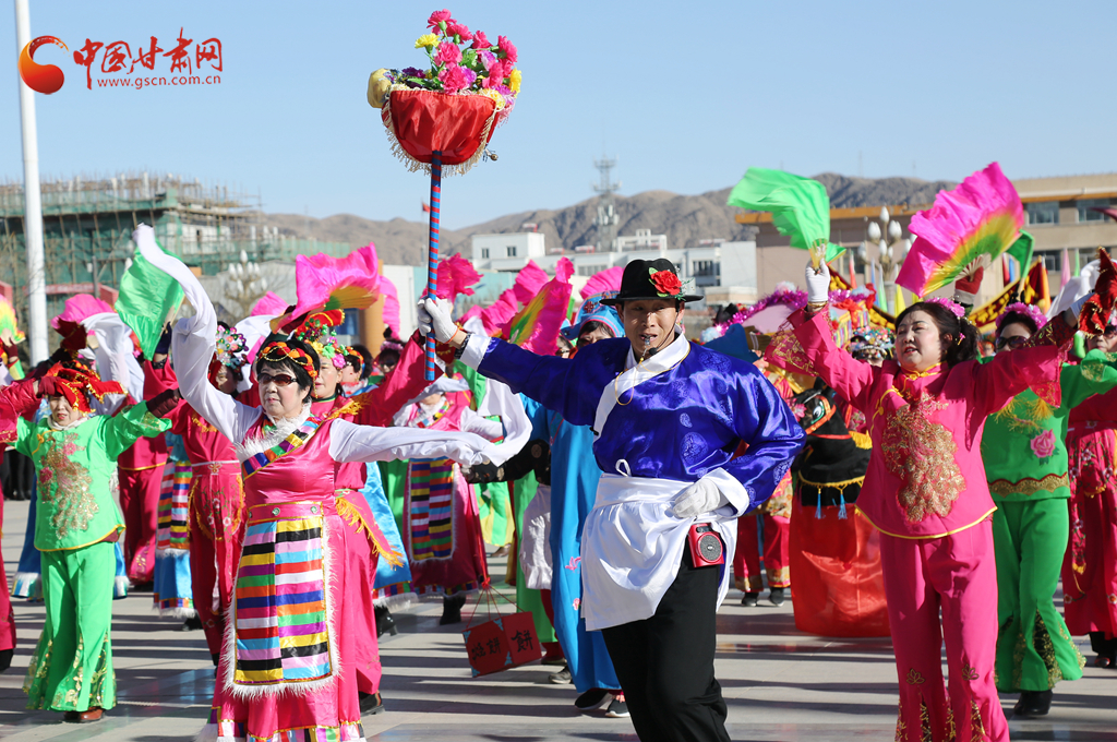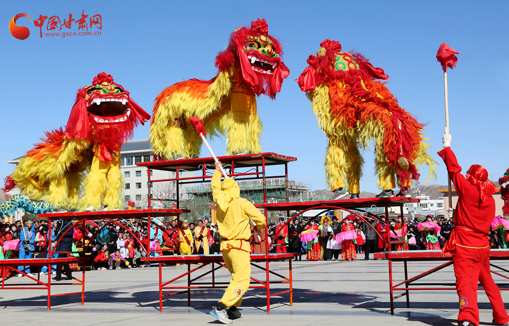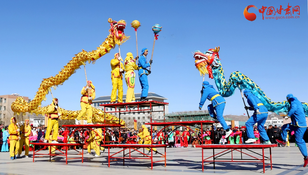 2月11日,来自金昌市永昌县的6支社火队正在为市民表演民俗节目。