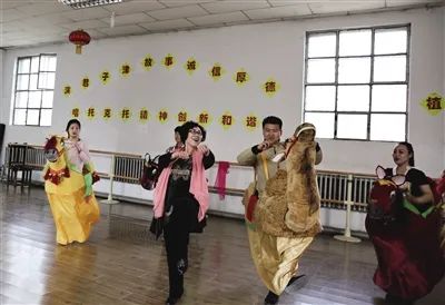 乌兰牧骑队员与托克托县第二小学的学生互动,手把手教他们秧歌。