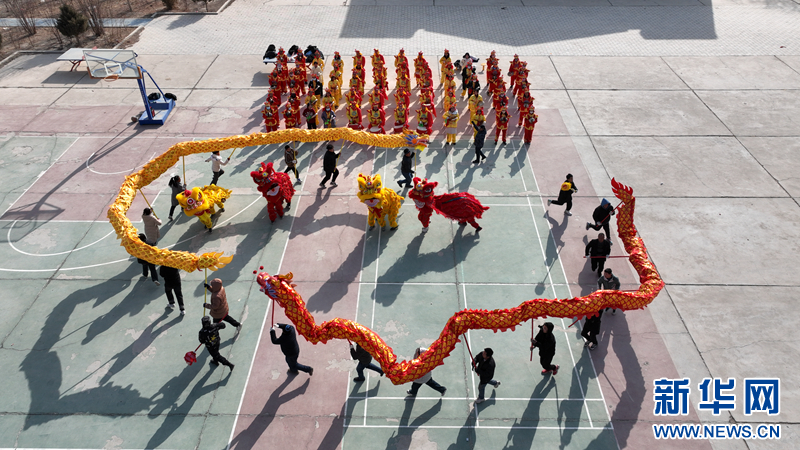在甘肃省酒泉市金塔县,演员正在进行舞龙舞狮排练。新华网发(梁蕊 摄)
