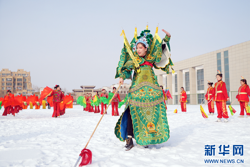 在甘肃省金昌市,新华路街道花漾社火队的队员正在进行社火排练。新华网发(张宏斌 摄)