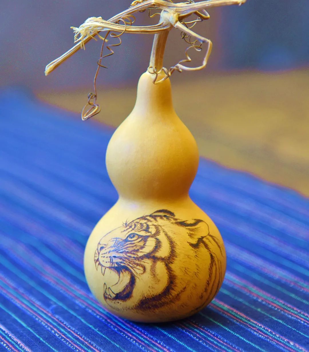 作品以葫芦为画布、烙笔为画笔,新颖巧妙地将孔武有力的老虎头刻画其上,借助葫芦的弧面更能凸显出虎头的立体感,使画作整体表现得更饱满。细腻精致的笔触,将炯炯有神的虎眼、锋利尖锐的虎牙、威风凛凛的虎毛描绘得栩栩如生、淋漓尽致。
