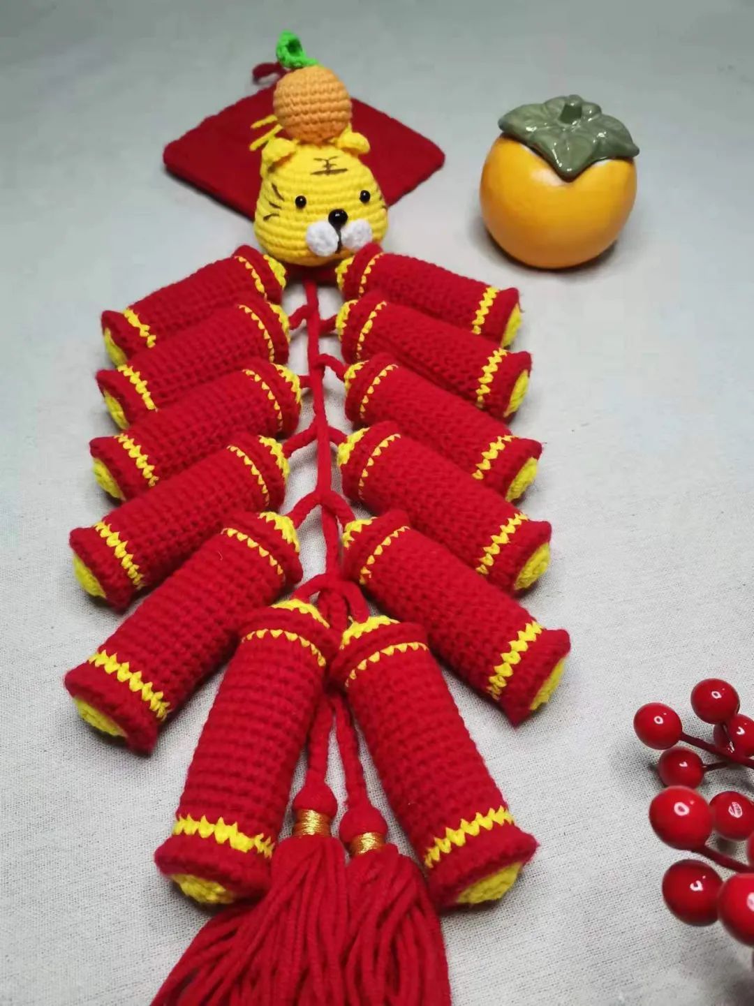 “爆竹声中一岁除,春风送暖入屠苏。”挂件用鞭炮象征未来一年红红火火、兴旺富足,小老虎和橘子则祈愿虎年大吉大利。