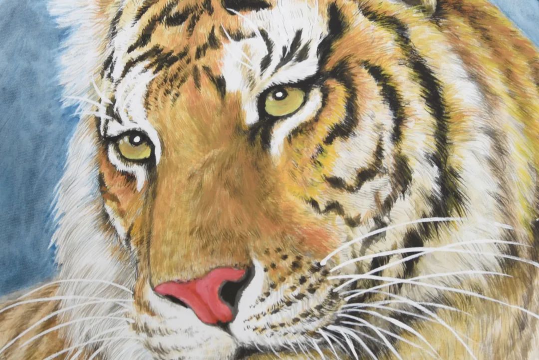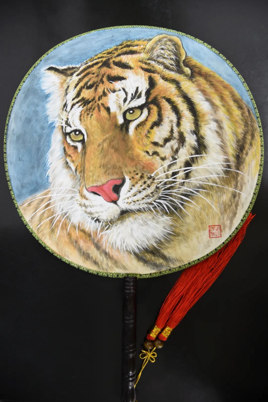 扇面画需在特定空间内安排构图,颇具巧思。这幅扇面画选取虎头部分入画,以传统国画技法模仿油画写实的风格,在宣纸扇面上作画,秉承传统的同时与现代审美相结合,将老虎描绘得栩栩如生,毛发清晰可见,一双虎眼炯炯有神,姿态凛然。挥动扇面,仿佛能感受到威严的“虎气”,寓意新的一年虎虎生“风”。