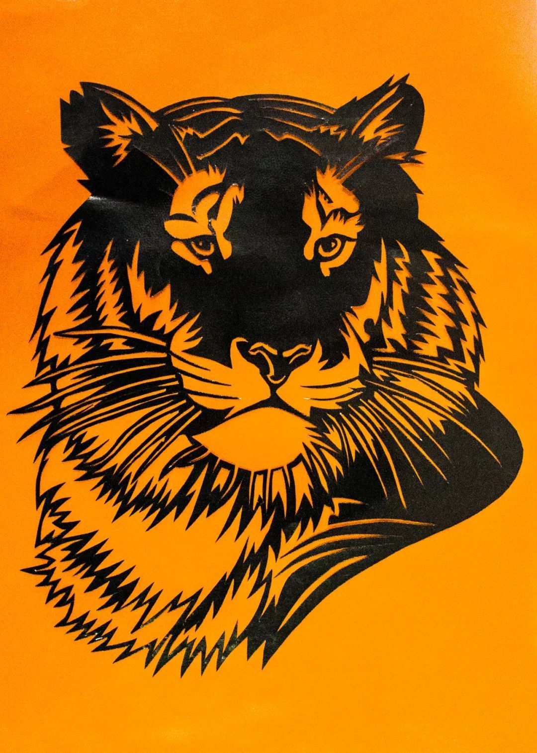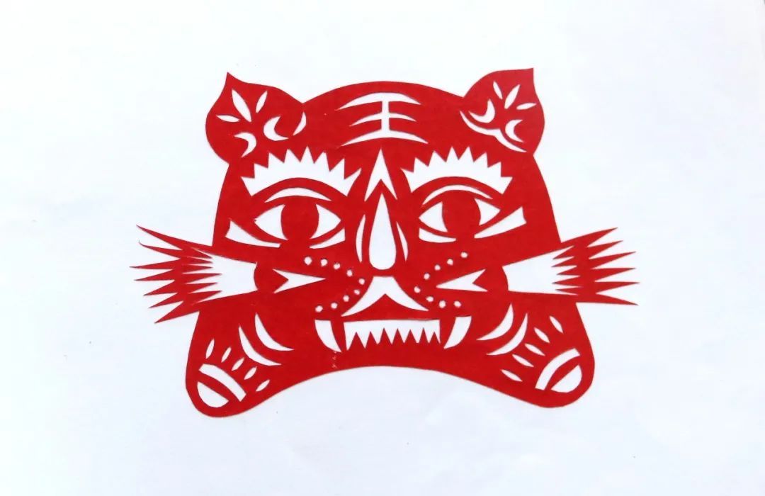 第一幅作品原型是东北虎,把黄色的色纸作为老虎的毛色,黑色的作为老虎的花纹,经过精心剪裁,东北虎的模样栩栩如生,充分展现出东北虎的威猛、勇敢。第二幅作品中的老虎看上去温顺、可爱,采用红色的色纸,表现出节日的喜庆。