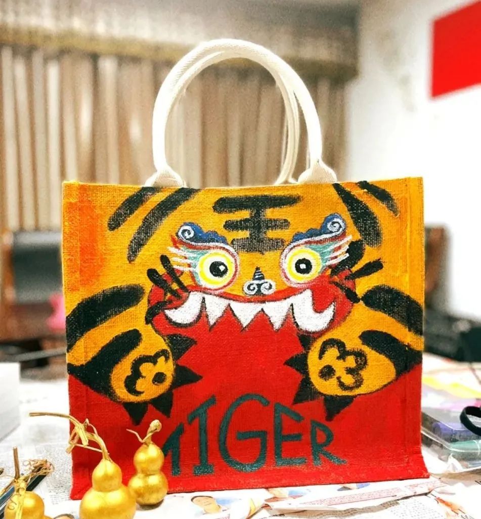 作品把时下流行的麻布包和虎年结合起来,用鲜明的色彩和可爱的卡通老虎形象展现在麻布包上。麻布包内层采用防水面料,外侧表面因麻布材质粗糙,经过一番打磨后再用丙烯颜料上色。作品用黄黑色表示老虎,红色代表春节的喜庆氛围,三种颜色搭配在一起给人强烈的视觉冲击。
