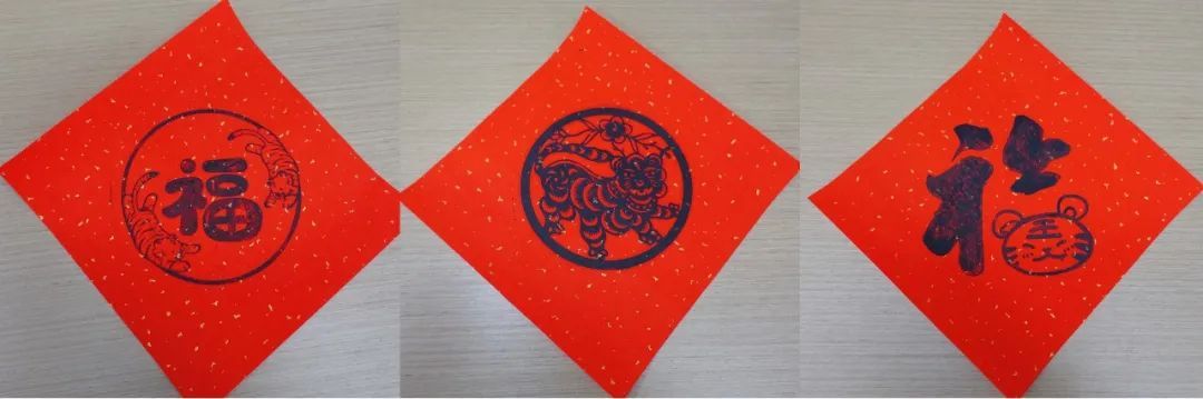 纸版画是拓印版画的新品种之一,该作品以“虎”为主题,三幅版画为一系列,在红底纸上形成虎虎生威、金虎纳福、金虎送福的景象,烘托出中国春节喜庆、热闹的氛围。