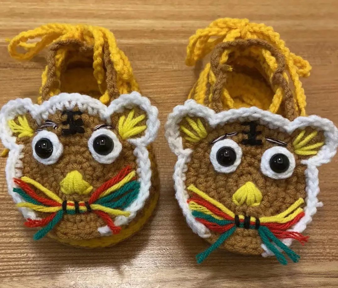 作品以绒线为基础材料,搭配棕、黄、白、红、绿4色,利用钩针来回钩织。鞋底双层非常紧实,鞋身钩织细节非常到位,老虎头顶的王字清晰可见,配合红绿黄的虎须显得既可爱又喜庆。