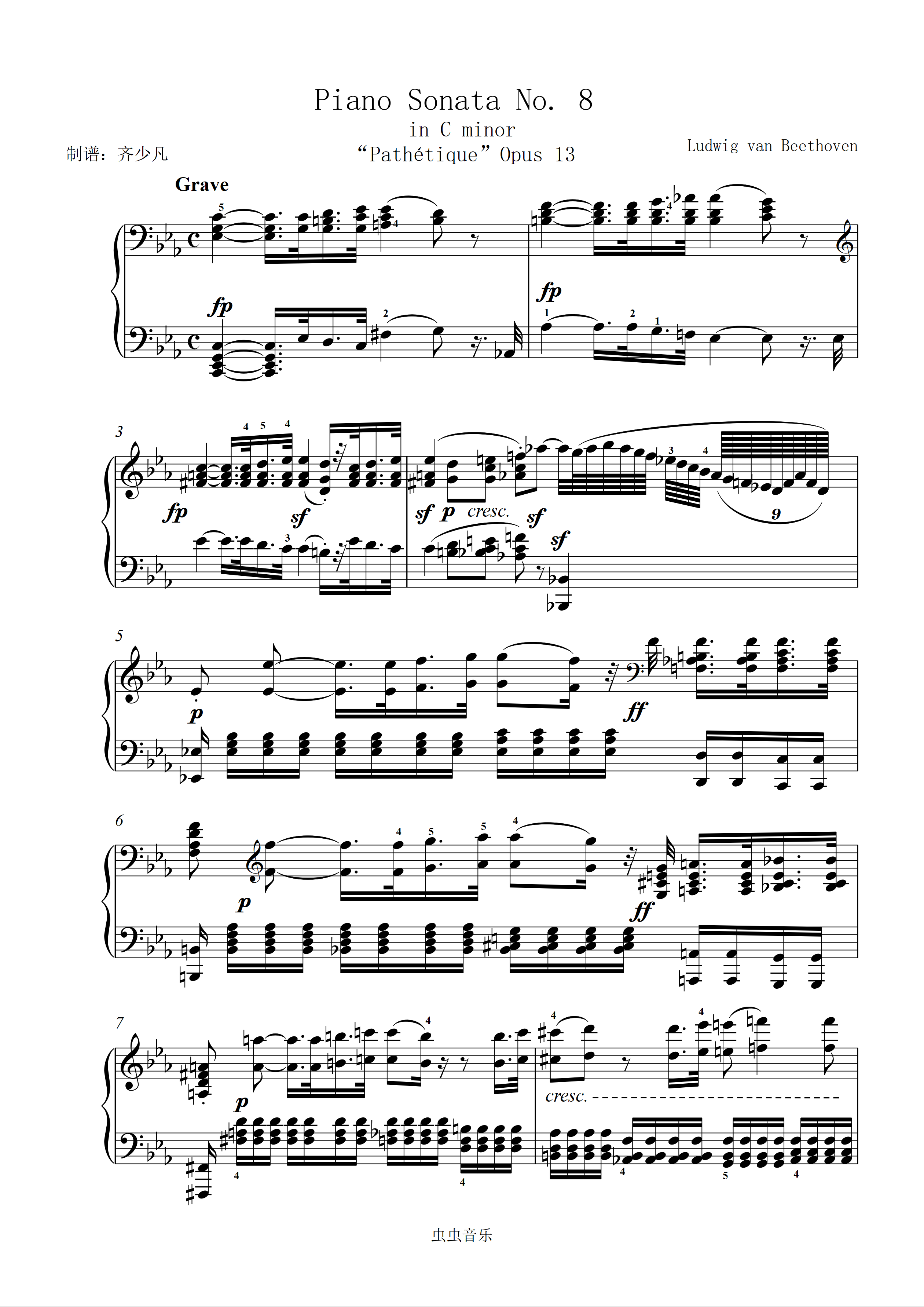 曲谱介绍:《悲怆》是贝多芬演唱的一首歌曲,贝多芬作曲,本首曲子是中等难度的c调钢琴歌谱(带和弦),适合有一定基础的同学学习哟