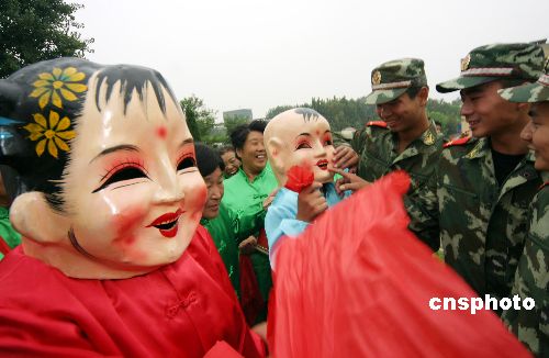 9月26日,徐州市鼓楼区的20多位老年腰鼓队员自发来到武警徐州市中队,戴起大头娃娃面具,擂响腰鼓,军民同庆喜迎中秋、国庆佳节的到来。中新社发 唐占军 摄