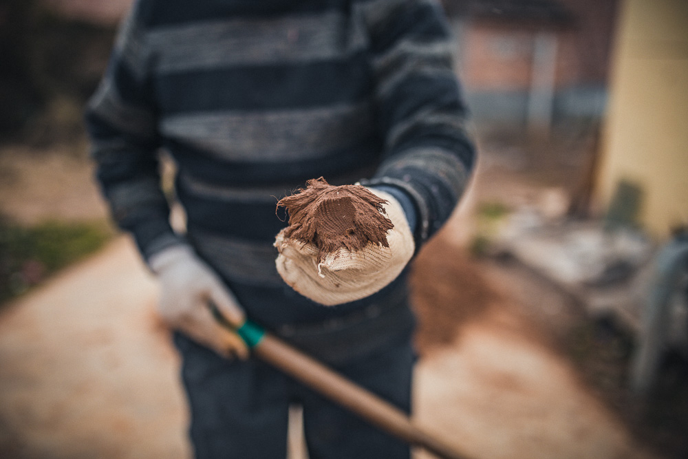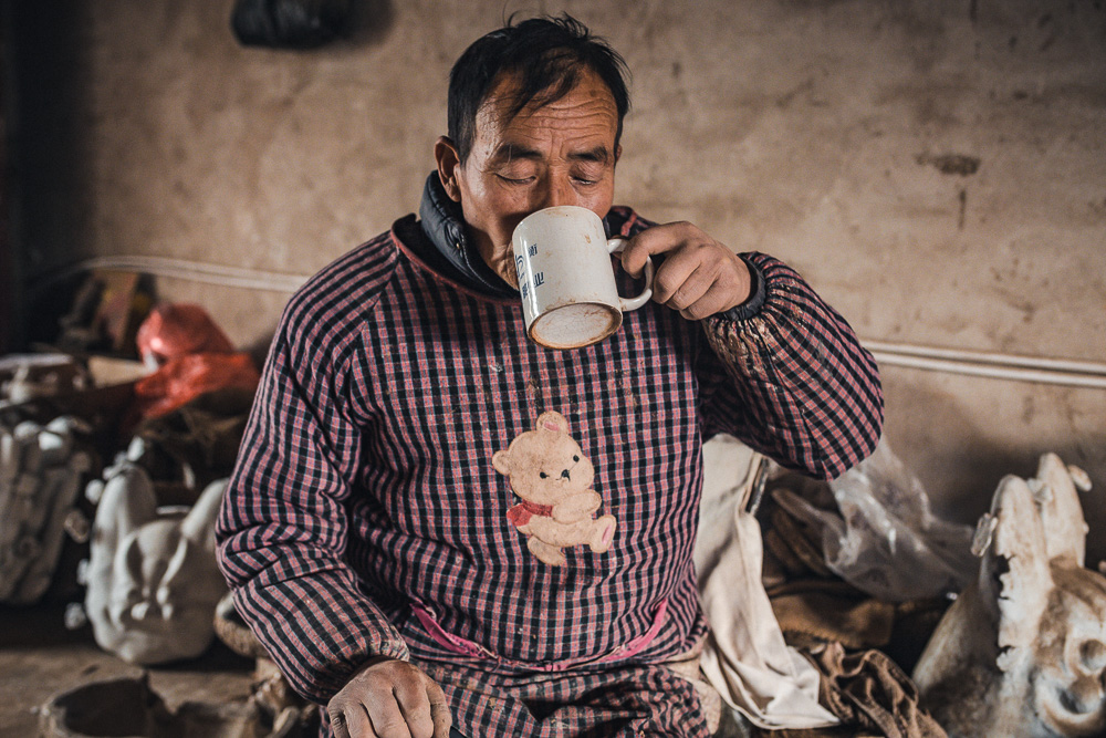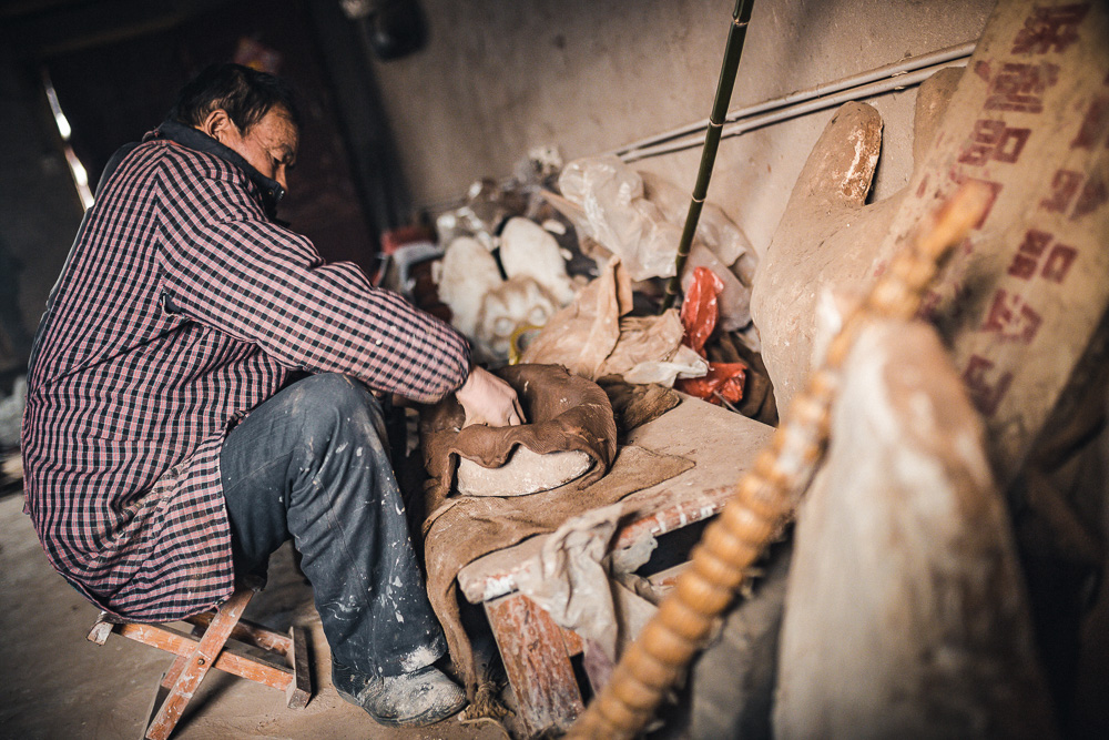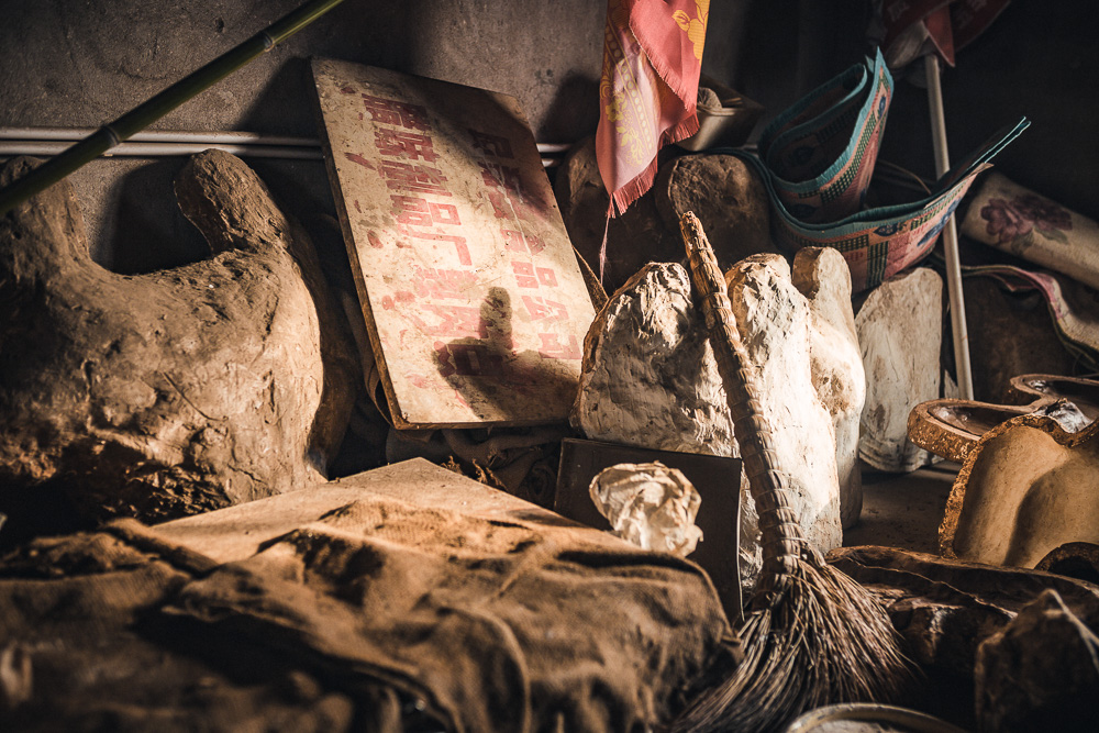 在屋子的后院正在“砸泥”的便是胡永露的弟弟,六合村附近的土叫观音土,非常适合做泥塑,因为土里没有任何杂质很纯净还有一定的油性。这样的土取回来以后会让他自然晒干。水和土会用一定比例混合,然后用锤子打压做成泥胚,这一步叫砸泥,是做泥塑的第一步。
