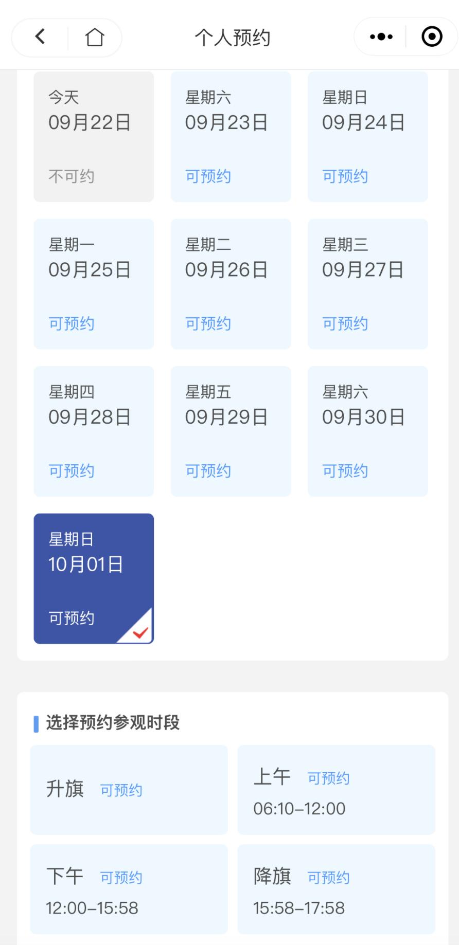 目前。10月1日“升旗”时段的预约已对外开放。今年“升旗”共有“00:00-03:10”、“03:10-04:10”、“04:10-05:10”、“05:10-06:10”这4个时段可供选择。需要注意的是,市民游客还需要再次选择核验地点,方能完成预约。