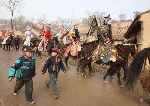 2月8日,陕西陇县东南镇黄花峪村村民在村里闹社火,庆祝即将到来的元宵节。陇县社火已有几千年历史,是陕西宝鸡社火的典型代表。宝鸡社火被誉为“黄土地上的狂欢节”。每年正月,社火表演队伍走乡串户、过街入巷,进行拜年