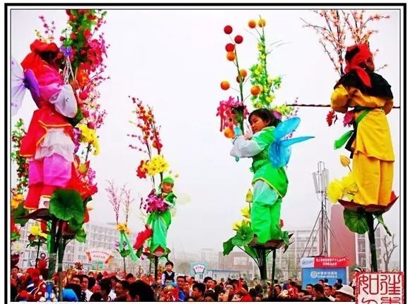 高跷也叫“高跷秧歌”,是汉族民俗舞蹈的一种形式,艺人们腿绑高跷,在音乐的伴奏下翩翩起舞,舞姿以雄健、惊险为主。